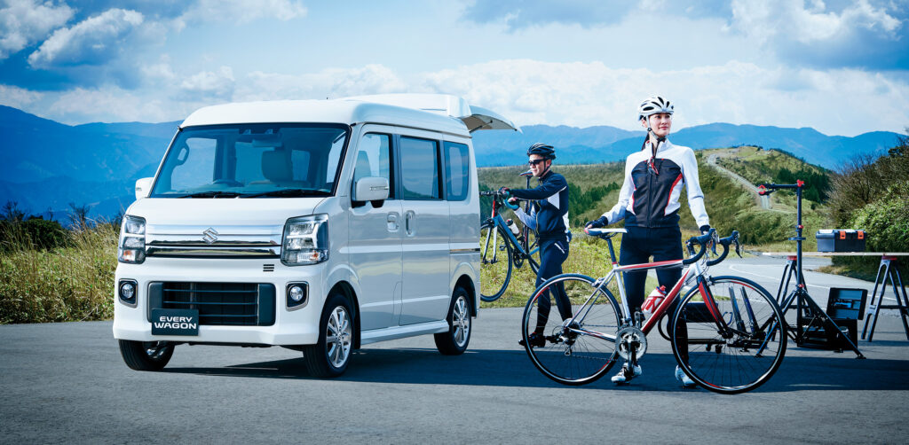 荷物も人もたっぷり運べるミニバンタイプの軽自動車、エブリイワゴン。広い室内空間とスライドドアで、ファミリー層やレジャー利用にも人気です。