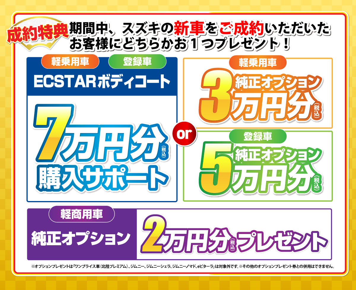 ※オプションプレゼントは「ワンブライス車(北陸プレミアム)、ジムニー、ジムニーシェラ、ジムニーノマド、eビターラ」は対象外です。※その他のオプションプレゼント券との併用はできません。